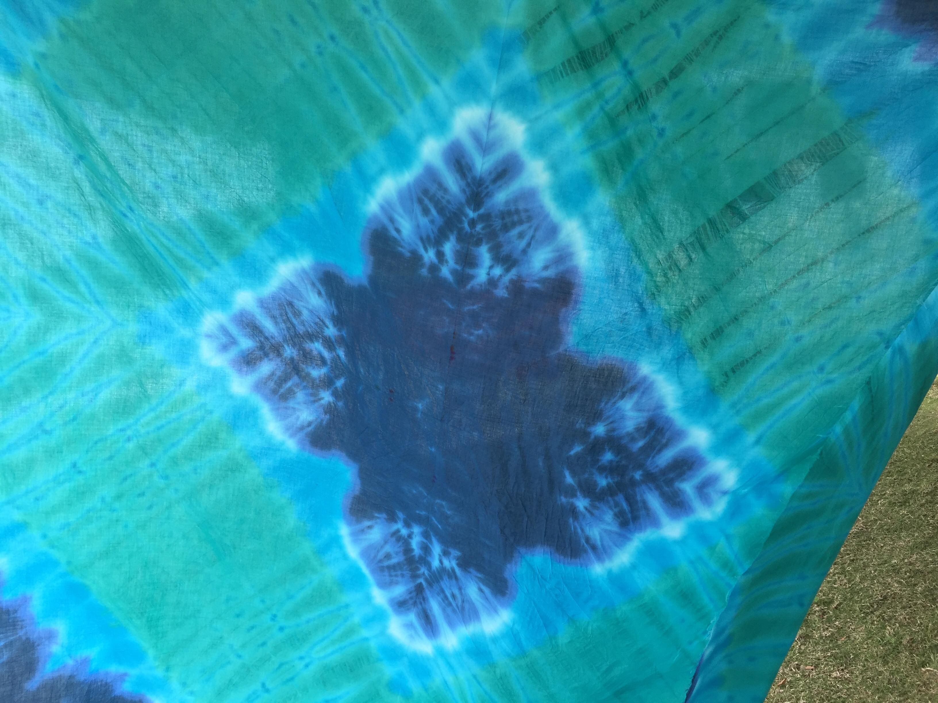 Traditional Japanese drying techniques of Shibori. Use specific folding binding and dip-dyeing techniques create the sample squares and one major piece. They were so enjoy with the artist, Jinni